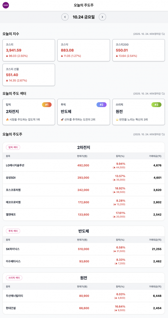 2차전지와 반도체가 대형주 중심으로 강하게 급등하며 지수를 견인했고, 원전 테마도 수급을 받으며 순위권에 안착했습니다. 시장 전반에 강한 랠리 분위기가 퍼졌습니다.