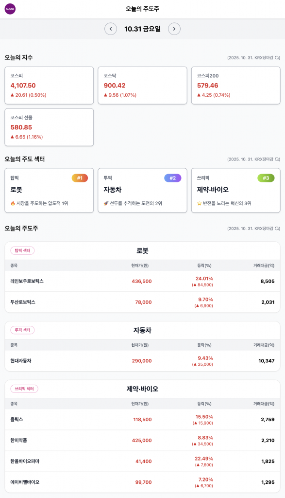 👉  로봇, 자동차, 제약·바이오 등 주도 섹터가 고르게 상승하며 코스피와 코스닥 모두 강세 마감. 특히 로봇 섹터는 테마성 급등 흐름을 보이며 시장의 중심으로 부상!