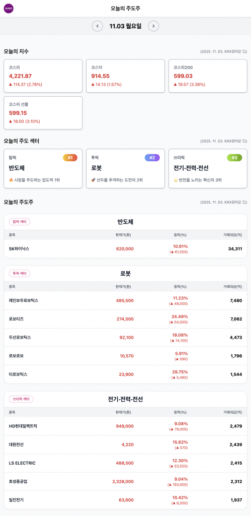 SK하이닉스를 중심으로 반도체 대장주가 지수를 끌어올렸고, 로봇·전력 섹터도 폭발적인 테마 상승세를 보이며 시장 전반에 훈풍을 불어넣었습니다.